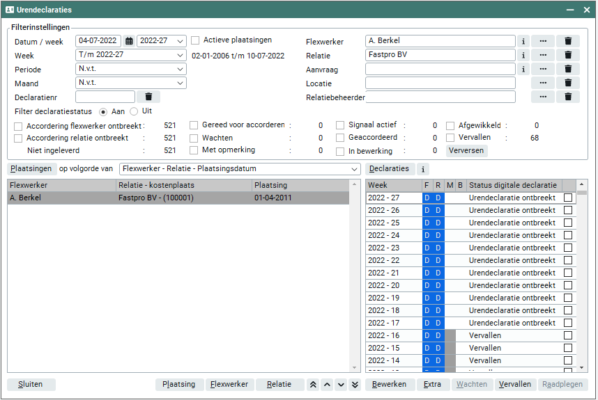 Je kunt één of meerdere filters instellen voor de betrokkenen. Zo kun je bijvoorbeeld alle urendeclaraties van een bepaalde flexwerker of relatie opvragen.