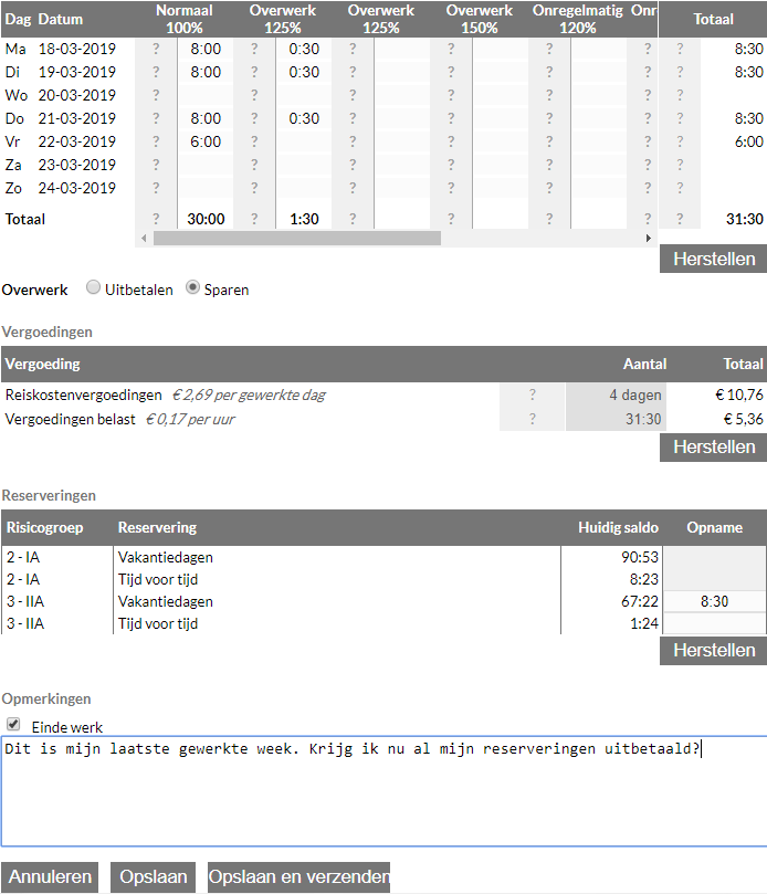 Met de knop 'Opslaan en verzenden' slaat de flexwerker de declaratie op en verzend hem naar Easyflex. Als de flexwerker gekozen heeft voor verzenden is het niet meer mogelijk voor de flexwerker om de declaratie nog aan te passen.