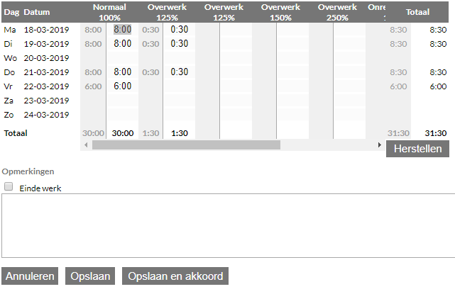 De kolom ‘Totaal’ telt zowel horizontaal als verticaal de uren bij elkaar op. De knop 'Herstellen' geeft de mogelijkheid om de wijzigingen in de declaratie ongedaan te maken en te herstellen naar de laatst opgeslagen versie.