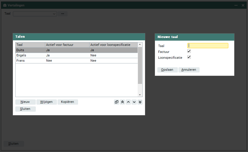 Vanuit ‘Beheer > Vertalingen’ is het mogelijk om andere talen vast te leggen en voor elk woord en elke zinsnede die voor kan komen op een factuur, loonspecificatie of jaaropgave een vertaling te maken. In deze procesbeschrijving wordt stap voor stap uitgelegd wat er voor nodig is om vertalingen vast te leggen in Easyflex. Daarbij kun je denken aan het eenvoudige woord ‘factuur’ of 'loonspecificatie', maar ook functies, looncomponenten en het omzetten van de datumnotatie.