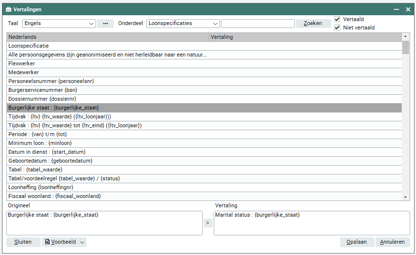 - Looncomponenten waarbij in de plaatsing of declaratie een afwijkende naam is vastgelegd worden niet vertaald.