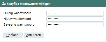 Binnen dit onderdeel is het mogelijk het wachtwoord waarmee je toegang tot Easyflex krijgt te wijzigen. Alle tekens die je ingeeft, worden automatisch als 'sterretje' getoond, zodat niemand kan zien wat je intypt.