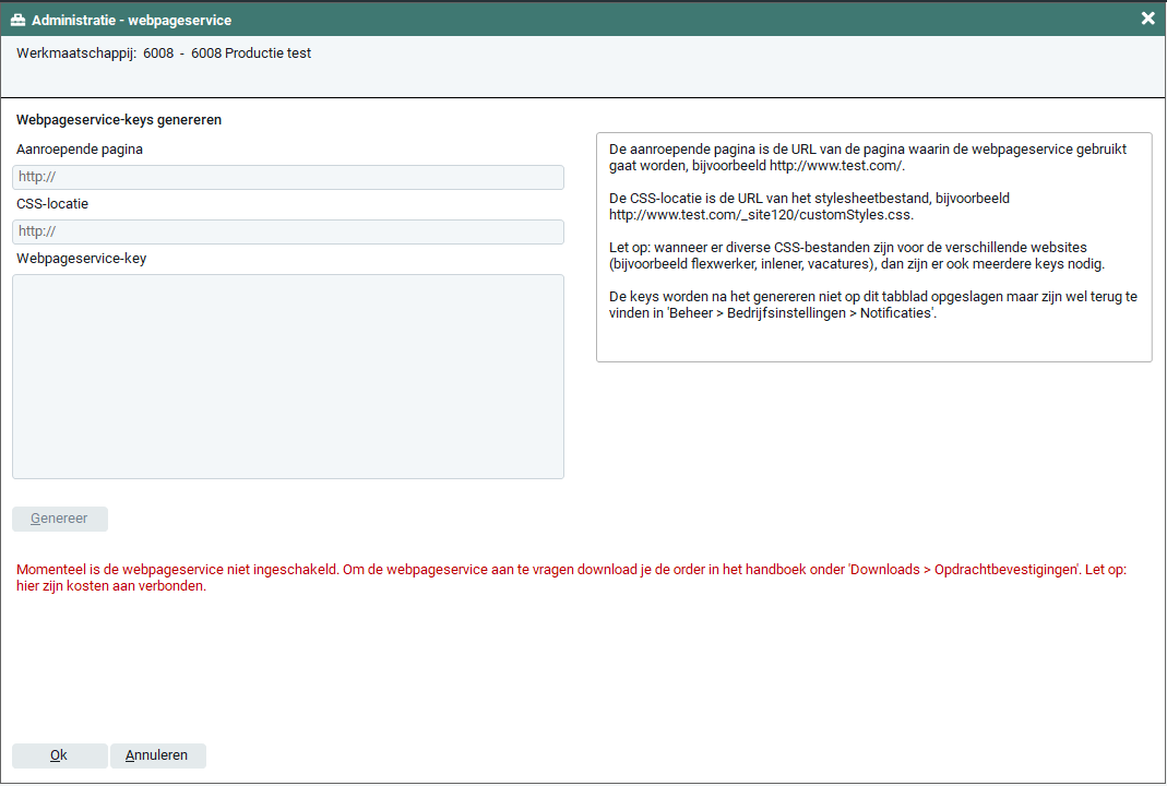 Na het invoeren van de aanroepende pagina en CSS-locatie kun je de key zelf genereren door op de 'Genereer' knop te klikken. De key wordt nu getoond in het scherm Webpageservice-key. Hier kun je de key selecteren en kopiƫren.